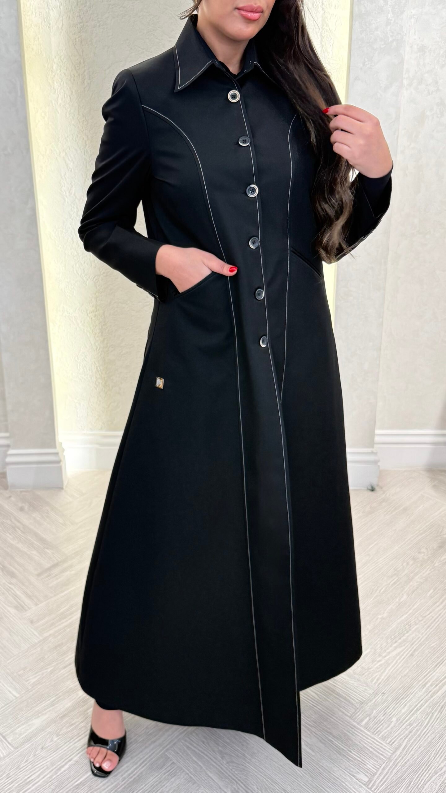 A chic navy blazer-cut abaya designed for a sharp, polished look. Tailored with clean lines and a structured silhouette, it’s the perfect day-to-night piece—effortlessly elegant, modern, and easy to style.