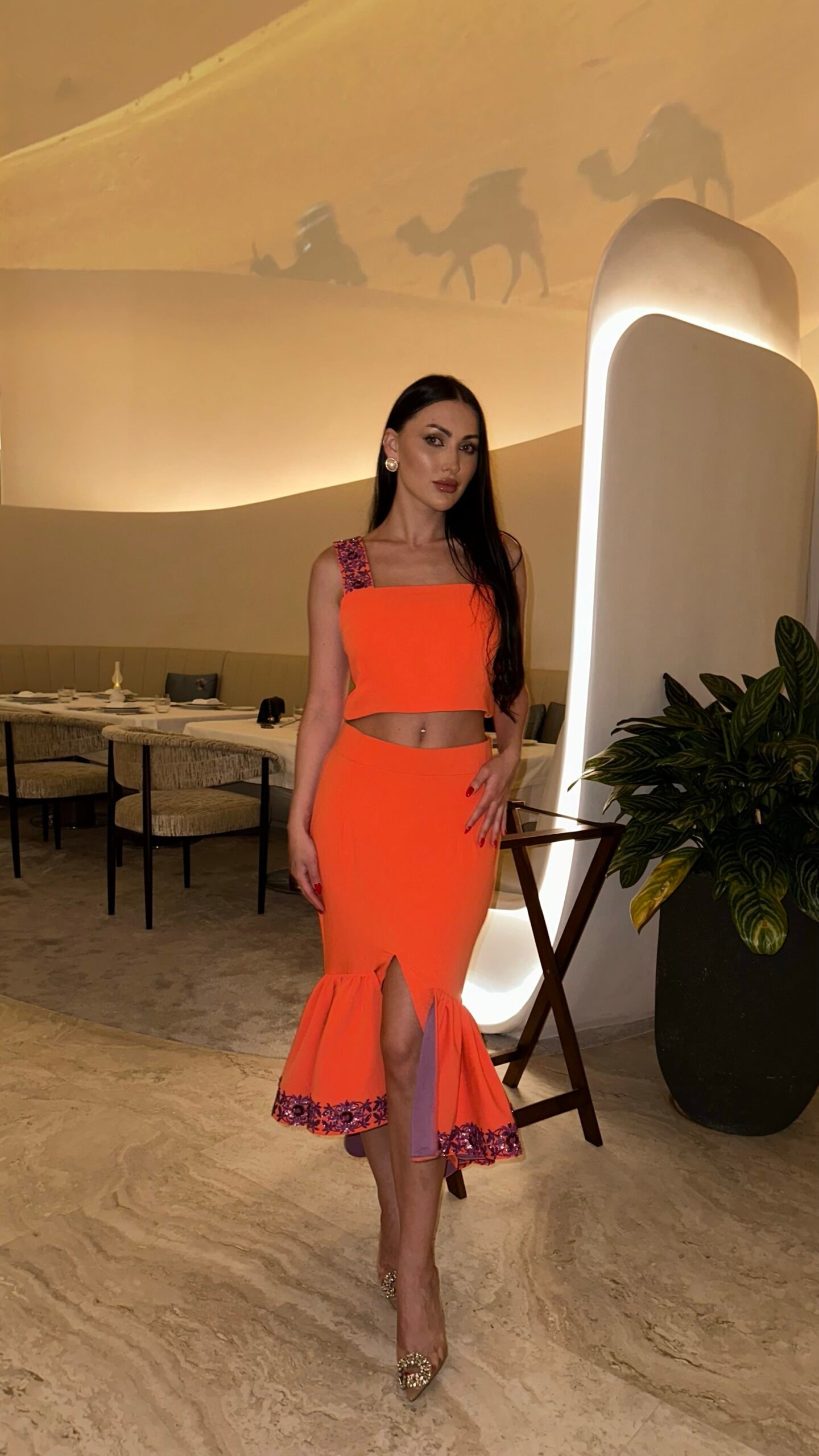 A bold two-piece set in vibrant orange and purple, featuring a matching top and skirt with refined purple embroidery. The skirt is designed with a front slit for an elegant, confident touch—striking, feminine, and made to stand out from every angle.